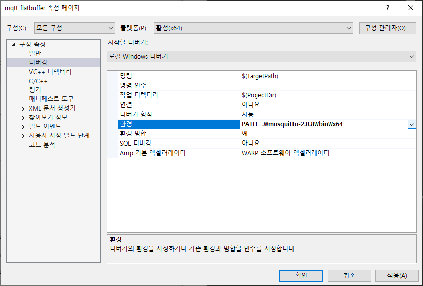 - 속성 > 디버깅 > 환경