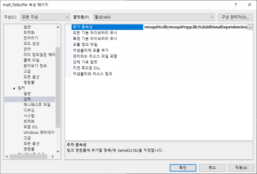 - 링커 > 입력 > 추가 종속성